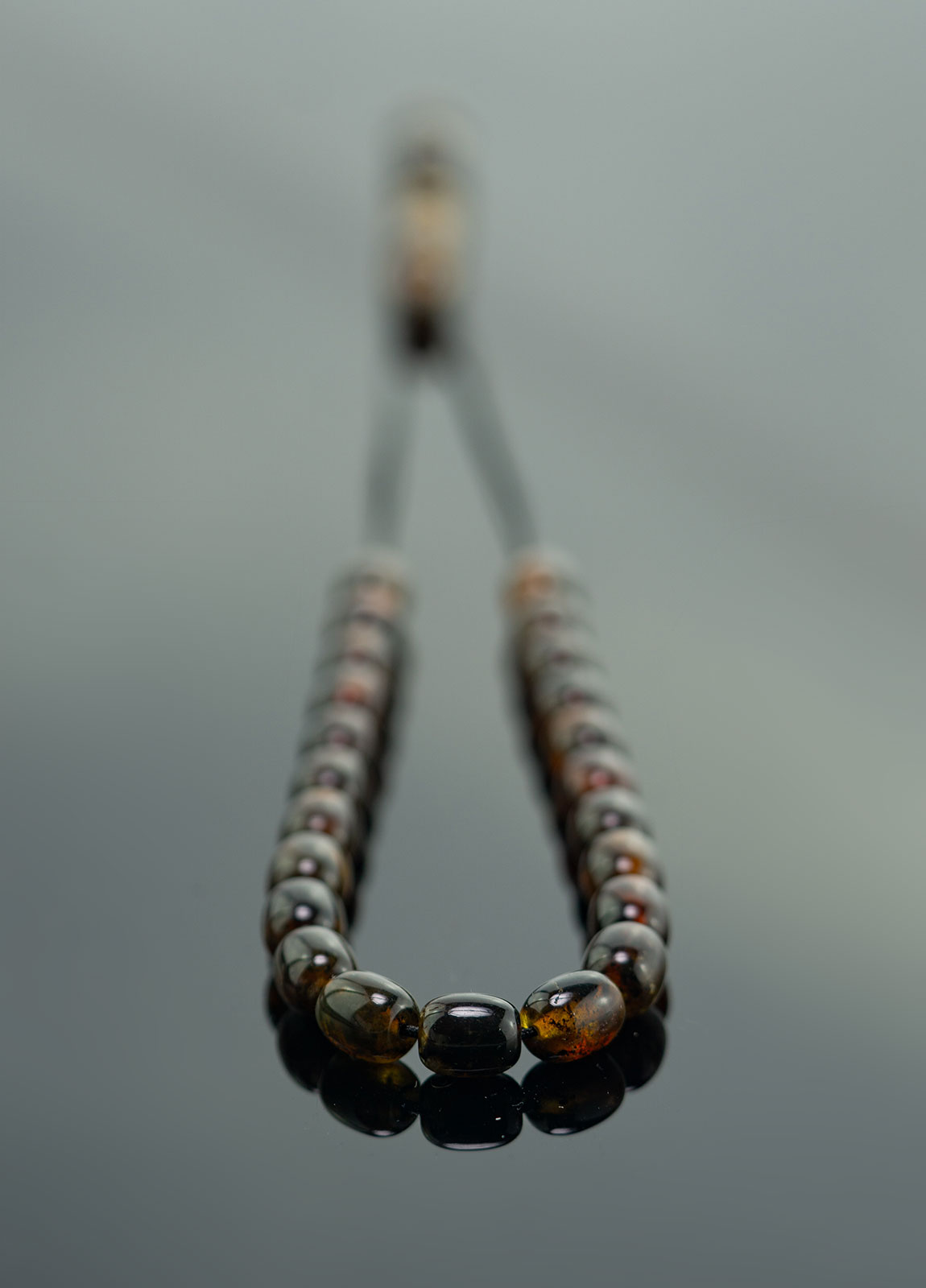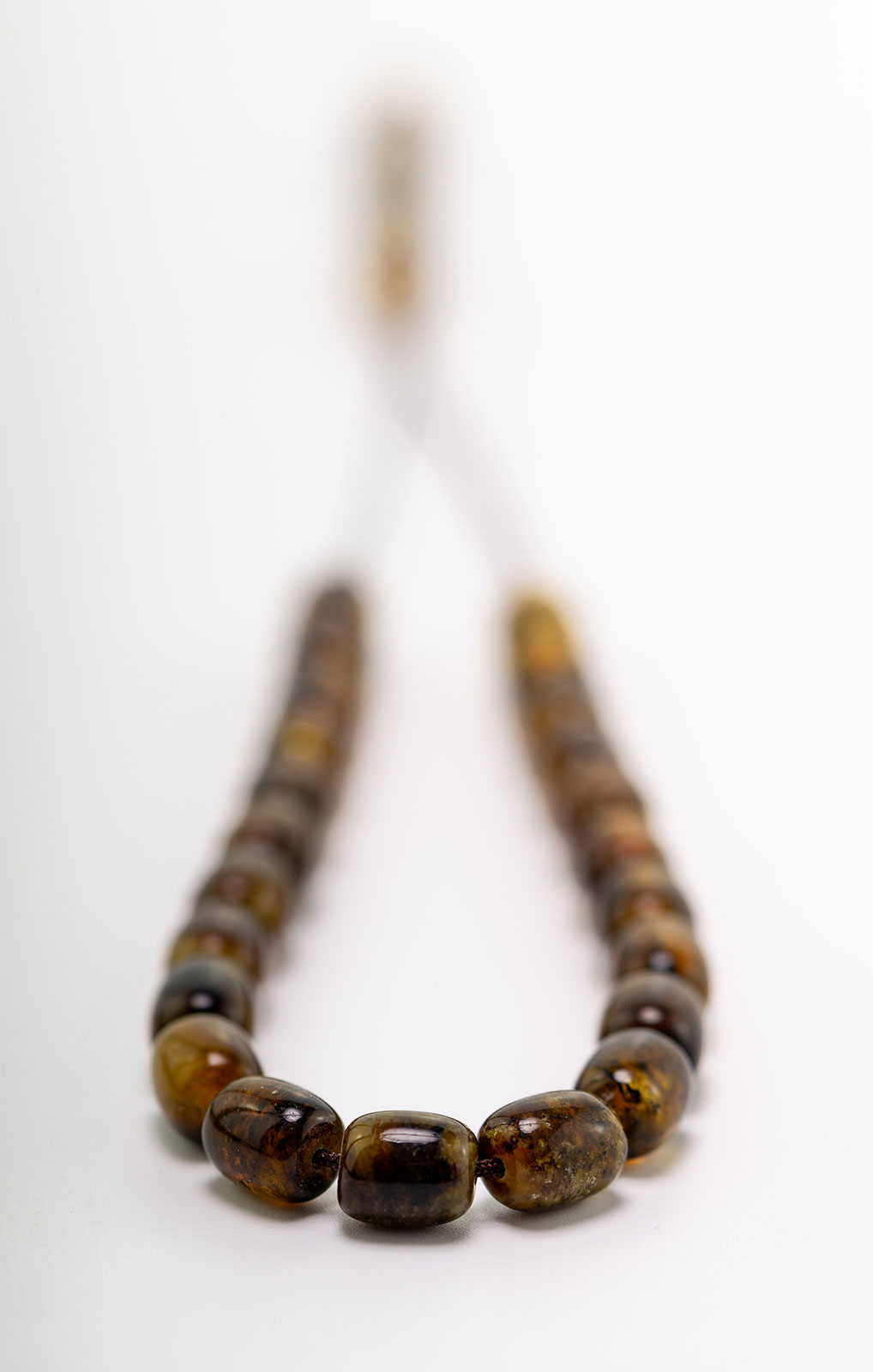 The laboratories, which process the amber and create the beads, collect the unexploited amber filings (process remains), as well as the unprocessed amber quantities. Afterwards, they press the above materials into moulds in high temperatures and thus create the pressed amber. Its colour varies, due to the mixed materials, the different pressure and temperature conditions.